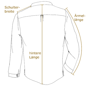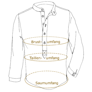Anhand der Größentabelle kannst Du die richtige Passform wählen. Die angegebenen Maße sind die des Hemdes und keine Körpermaße. Bedenke, dass Du in Deinem Hemd Bewegungsfreiheit benötigst.